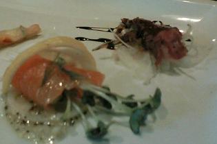 手前はスモークサーモンとカイワレ、右は牛肉のたたき、左にちょっと見えているのはひとくちピザです。