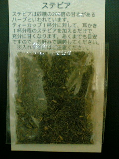 「ステビアは砂糖の約200倍の甘さがあるハーブといわれています。ティーカップ一杯分に対して耳かき一杯分程度のステビアを加えるだけで充分に甘くなります。あくまでも目安ですので、お好みで調節してください。」