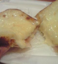 パン、ホワイトソース、ハム、チーズ、パン、チーズ(とろり)、チーズ(香ばしい)、だと思います、たぶん。